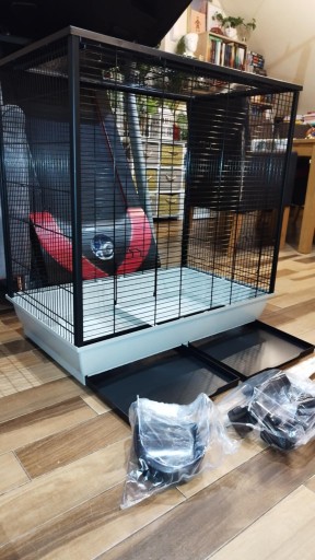 W zestawie: 4 miski, 1 poidełko do wody, 4 żerdki drewniane, 1 miska do kąpieli