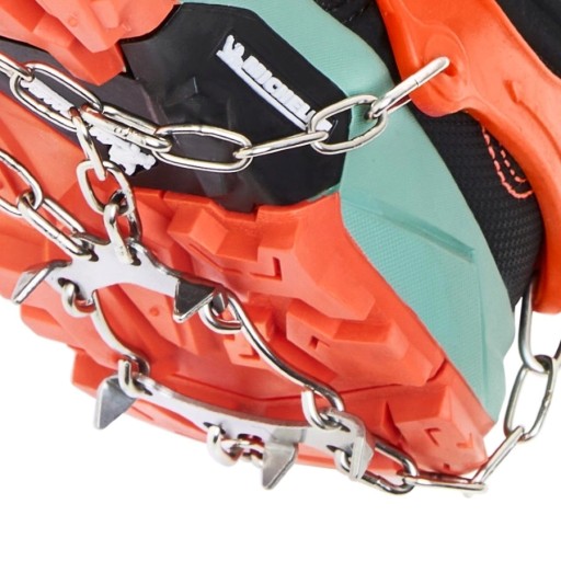 Raczki turystyczne MOUNTAIN GOAT Premium to profesjonalne wyposażenie wszelkiego rodzaju górskich wypraw. Mają system łańcuchów z szerokimi płytkami, 13 mocnych zębów oraz w zawiasowe podparcie przedstopia. Wszystkie te elementy wykonano z odpornej stali nierdzewnej. Wytrzymałe kolce idealnie sprawdzą się podczas wspinaczki po niższych partiach gór na oblodzonych i nierównych ścieżkach. Dodatkowy system szerokich płytek i zawiasów pozwala na lepsze trzymanie się zlodowaciałego podłoża. Łańcuchy i zęby wspomogą balansowanie ciała na śliskiej powierzchni. Do tego uchronią też przed poślizgnięciem się czy utratą równowagi. Po zakończonej aktywności raczki wytrzyj szmatką do sucha, aby zachować je w dobrym stanie przez wiele sezonów.