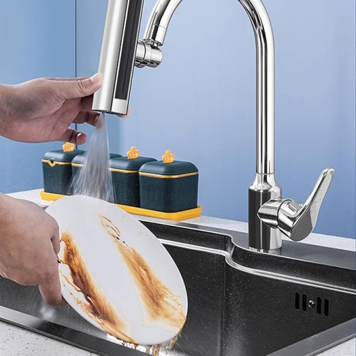 - Uniwersalny, posiada 4 funkcje ułatwiające codzienne czynności, np. silny strumień do mycia naczyń, czy szeroki strumień do płukania owoców.