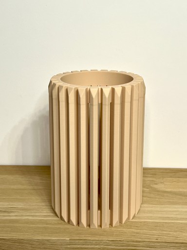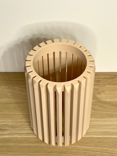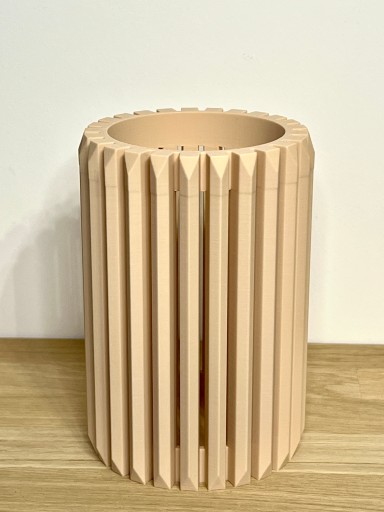 Ten wyjątkowy wazon został wydrukowany w technologii druku 3D. Ma lekką i bardzo ciekawą konstrukcję, a dzięki swojemu unikalnemu kształtowi idealnie prezentuje się sam jak i z kwiatami. Pięknie pasuje zarówno do kwiatów sztucznych jak i modnych suszonych traw.