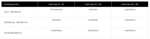 Wymagana ilość dozowań w zależności od liczby przejechanych kilometrów do ilości oleju mieszczącego się w misce olejowej.