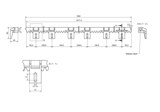 Listwa zębata 1,0m nylonowa z rdzeniem stalowym CAME PL0659 w komplecie z elementami do mocowania