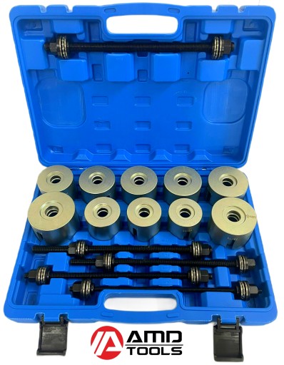 Zestaw ściągaczy marki AMD TOOLS do wyprasowywania/ wprasowywania tulei metalowo gumowych na samochodzie bez konieczności demontażu wahaczy