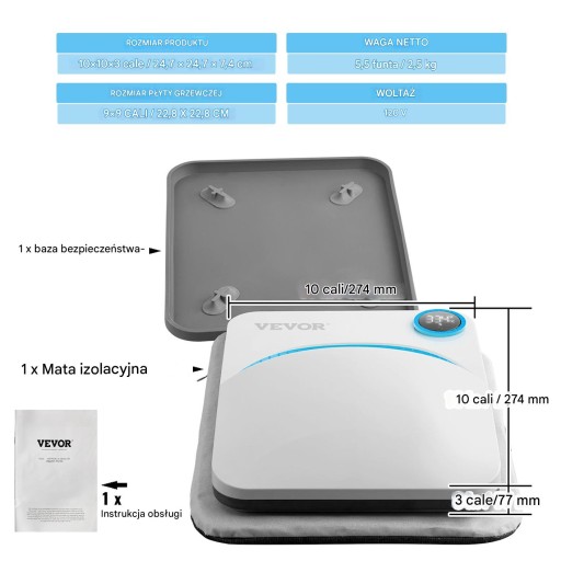 - Wymiary płyty grzewczej: 22,8 × 22,8 cm