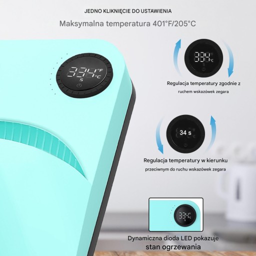 Obróć pokrętło w prawo, aby ustawić temperaturę, a w lewo, aby ustawić czas. W porównaniu z tradycyjnymi prasami, nasza przenośna prasa termiczna posiada 9 wskaźników LED oraz duży cyfrowy wyświetlacz, co pozwala na szybki podgląd ustawień temperatury i czasu. Dzięki temu każda operacja staje się łatwa i intuicyjna. To czas na relaks!