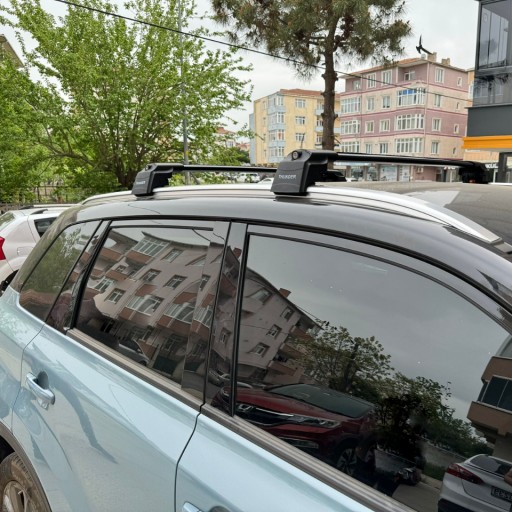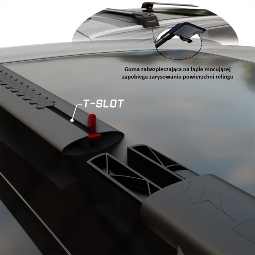 ➡️Bagażnik montowany na relingi, belki umieszczone są nisko nad dachem.