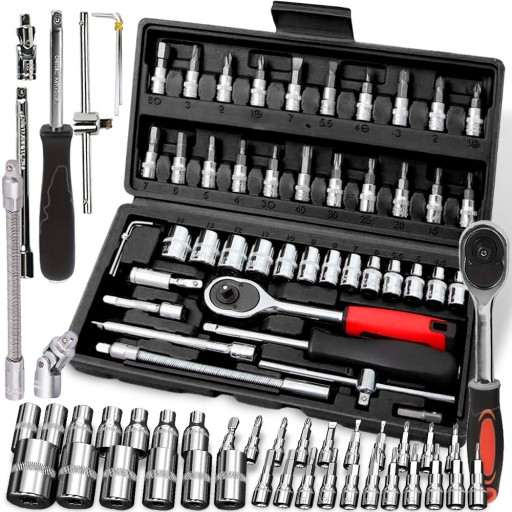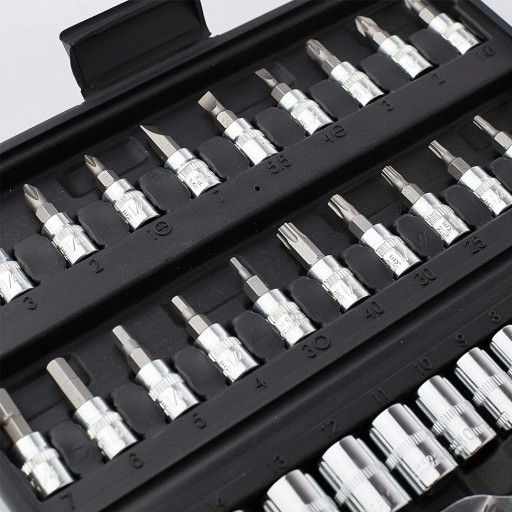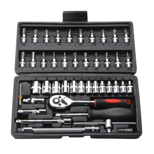 Zestaw kluczy nasadowych składa się z 46 elementów, wykonanych z wysokiej jakości stali chromowo-wanadowej.