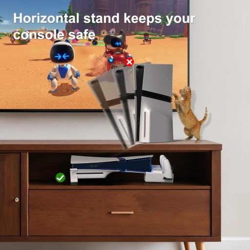 - Podstawka pozioma do PS5 Slim/Pro Disc & Digital Edition: Ta podstawka pozioma jest przeznaczona do konsoli PS5 Slim i PS5 Pro, kompatybilna zarówno z edycją Disc, jak i Digital Edition. Zapewnia stabilne umieszczenie konsoli, zmniejszając ryzyko przypadkowego przewrócenia. Pozioma konstrukcja poprawia wentylację w porównaniu z konfiguracjami pionowymi, optymalizując wydajność chłodzenia podczas długich sesji grania. UWAGA : Niekompatybilny ze standardową wersją 2020 PS5.