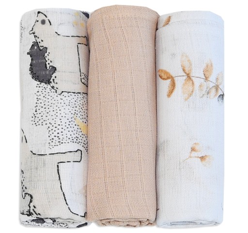W zestawie znajdują się 3 różne pieluszki, zapakowane w przeźroczysty woreczek, mogący stanowić dodatek np do prezentu dla dziecka