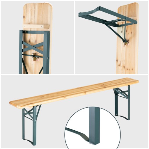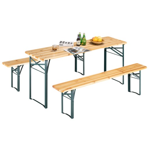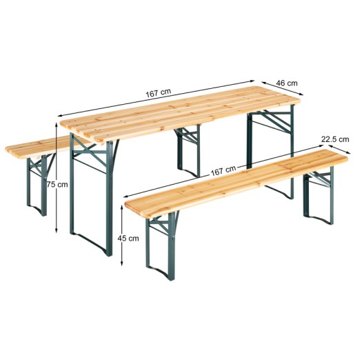 Wykonany z drewna z solidną stalową ramą zapewnia doskonałą stabilność. Wierzch i krawędzie drewna zostały polakierowane bezbarwnym lakierem do drewna w celu ochrony przed wilgocią. Niezależnie od tego, czy są to urodziny, imprezy czy inne wydarzenia - ten komplet ogrodowy jest zawsze idealnym rozwiązaniem!