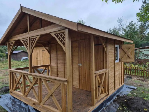 - Konstrukcja drewniana domku z tarasem wykonana z suszonej komorowo sosny