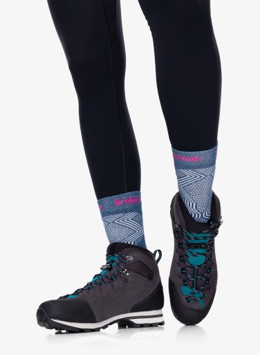 Buty damskie Hanwag Makra Light GTX - asphalt/bluegreen korzystają ze skóry Perwanger® oraz materiału Cordura®. Już ten fakt powinien być dowodem na to, z jak wytrzymałą konstrukcją posiada ten model. Zabierzesz je na podejście pod wspinaczkową ścianę, via ferraty, a także klasyczny trekking w zróżnicowanym terenie.