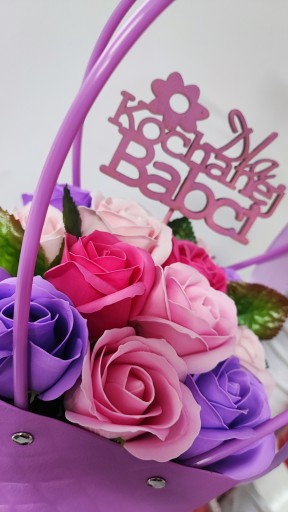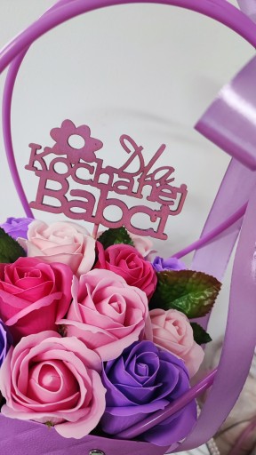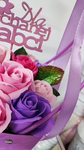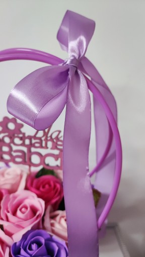 Ozdobne pudełko w kształcie koszyczka w kolorze fioletowym wypełnione różami to znakomity prezent dla babci...który sprawi obdarowanej osobie mnóstwo pachnącej radości...