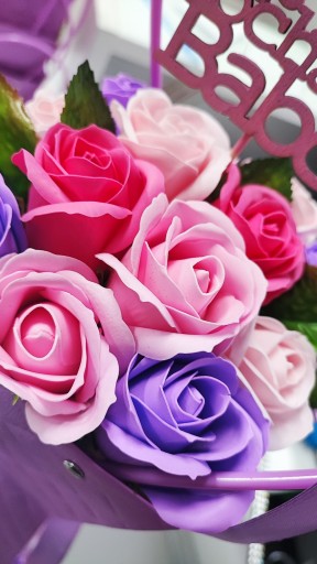 Torebka box z pachnącymi różami z mydła nadającymi się do kąpieli. Róże ładnie pachną i ślicznie wyglądają....Nie więdną jak prawdziwe kwiaty. Długo będą cieszyć oczy osoby obdarowanej...