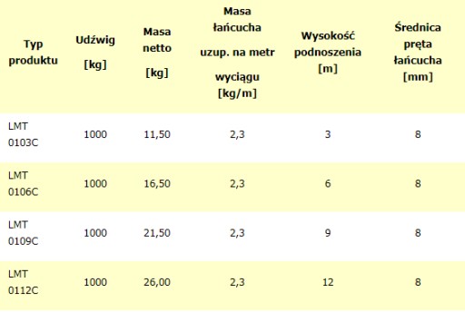Dostępne różne udźwigi i wysokości podnoszenia 3m, 6m, 9m, 12m