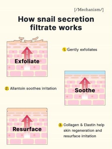 - filtrat ze śluzu ślimaka - wspomaga w leczeniu trądziku, zmniejsza widoczność ujść gruczołów łojowych, silnie nawilża i zmiękcza skórę oraz rozjaśnia przebarwienia,