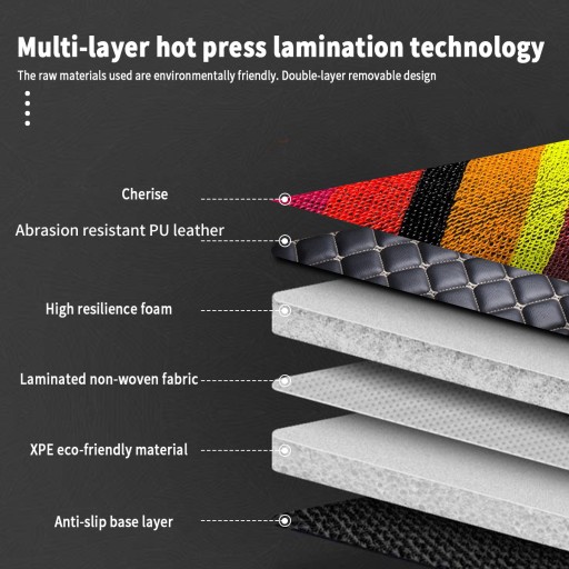 - [Materiał]: Jest to dwuwarstwowa mata podłogowa, która składa się z dwóch części. Dolna warstwa to skórzana mata podłogowa, wykonana z wysokiej jakości skóry, elastyczna, odporna na zużycie i super wodoodporna. Na środku znajduje się warstwa pianki XPE, która sprawia, że mata jest bardziej miękka i elastyczna. Wierzchnia warstwa to materiał szenilowy.