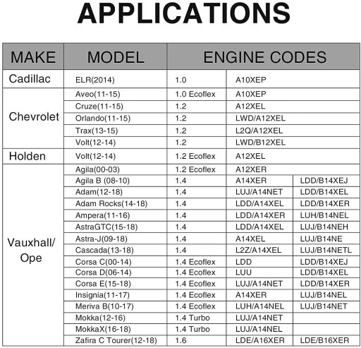 - Adam, Ampera, Astra-J, Aveo, Corsa-D, Meriva-B, Mokka, Zafira-C Tourer z silnikami o pojemnościach 1.0/1.2/1.4.