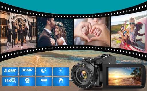 - Ta kamera wideo obsługuje nagrywanie wideo FHD 1080 P i rozdzielczość obrazu 36 MP. 3,0-calowy ekran IPS obsługuje obrót o 270° i 16-krotny zoom cyfrowy.