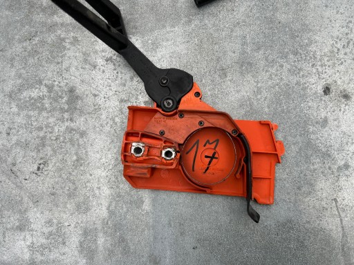Osłona jest oryginalnej produkcji marki Husqvarna, przednie mocowanie jest uszkodzone, co widać na zdjęciach, ale rączka hamulca jest cała, i hamulec bezpieczeństwa działa bez zarzutu.