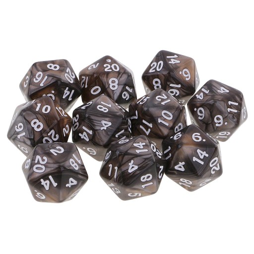 Zawiera 10 sztuk 20-ściennych kostek K20, są to kostki dwukolorowe.