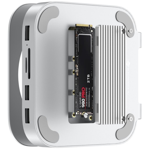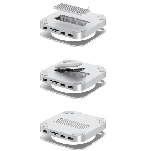 - Interfejsy: 1x M.2 (NVMe/SATA), 2x USB-A 3.1, 1x USB-A 2.0, 1x Czytnik kart SD 4.0, 1x Czytnik kart microSD 4.0, 1x HDMI (4K@60Hz), 1x Port USB-C (podłączenie do Mac Mini), 1x Port USB-C (zasilanie 5V/2A)