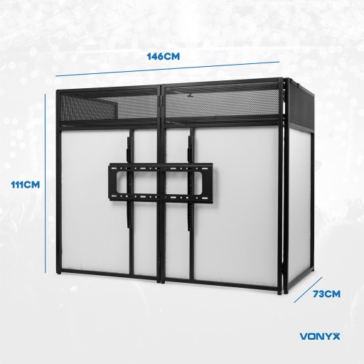 DJ Booth Vonyx DB6 posiada blat o szerokości 146cm i głębokości 73cm, z wysokością roboczą wynoszącą 113cm, który pomieści sprzęt o łącznej wadze do 50kg. Dodatkowo, stanowisko oferuje drugi poziom roboczy, idealny do ustawienia laptopa, efektów świetlnych lub innej aparatury. Dzięki krawędziom zabezpieczającym oraz systemowi organizacji kabli, DJ Booth pozwala na estetyczne ukrycie przewodów i jednocześnie zapewnia ochronę dla cennego sprzętu.