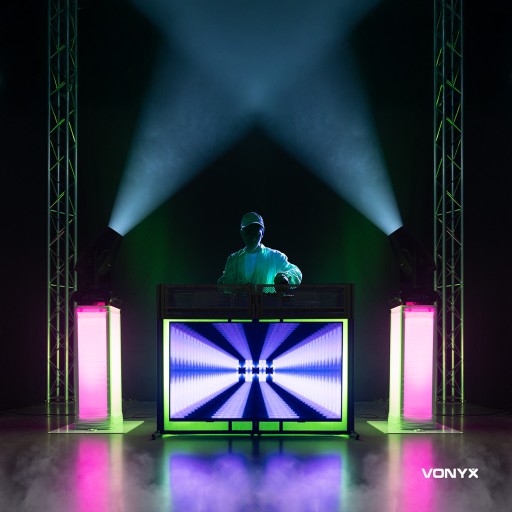 Aby dodać głębi do swojego występu, możesz umieścić efekty świetlne pod DJ Booth. Model DB6 jest dostarczany z dwoma panelami z lycry – białym i czarnym. Biały panel przepuszcza światło, co pozwala uzyskać efektowne iluminacje przy użyciu reflektorów PAR, jellyballi lub innych efektów świetlnych. Oczywiście, stanowisko można również używać bez telewizora.