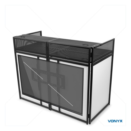 Wspaniale jest móc wyświetlać własne wizualizacje lub logo podczas występu DJ-a! Dzięki modelowi DB6 od Vonyx zyskujesz DJ Booth, który oferuje tę wyjątkową funkcjonalność. Przednia część stanowiska jest wyposażona w uchwyt na telewizor, który pozwala zamontować ekran o przekątnej od 32 do 65 cali. To idealne rozwiązanie zarówno dla stacjonarnych instalacji, jak i dla mobilnych DJ-ów. DJ Booth DB6 jest w pełni składany, co umożliwia jego łatwe przenoszenie. Blat i obudowa stanowiska są proste w montażu i demontażu, a wszystko można schować w dołączonej torbie transportowej. Wystarczy kilka minut, aby przygotować się na kolejny występ!