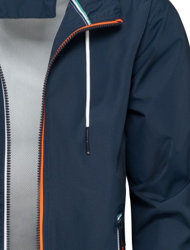 Wiatrówka z kapturem - męska kurtka w granatowym kolorze z pomarańczowo-czerwonym i białym paskiem przy suwakach. Kurtka posiada kaptur z możliwością regulacji poprzez troczki. Dół kurtki i rękawy zakończone ściągaczami. Z boku kieszenie zamykane na zamek, wewnątrz jedna kieszonka wsuwana. Kurtka zasuwana na suwak. Skład materiału kurtki: 100% poliuretan, podszewka 100% poliester.