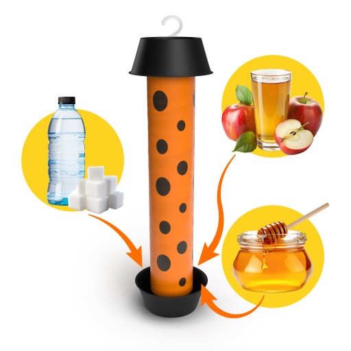 Aby uzyskać najlepsze rezultaty, należy zawiesić pułapkę pionowo, w pobliżu środka obszaru, w którym występują owady. Dodać 1 łyżeczkę miodu lub syropu do dolnego plastikowego kubka.