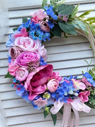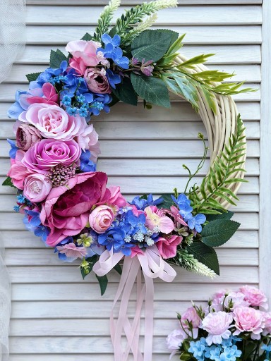 WIANEK KWIATOWY NA DRZWI WIOSENNY WIENIEC WIKLINOWY RÓŻOWY NIEBIESKI