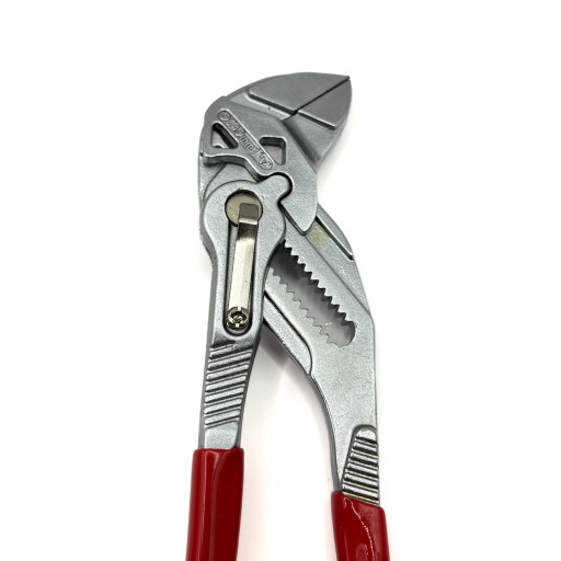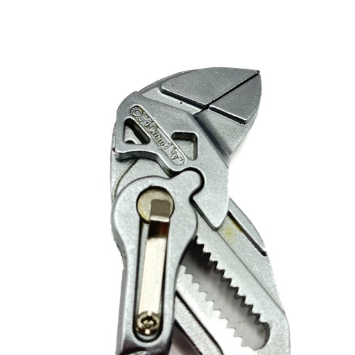 - Przycisk blokujący - Intuicyjny mechanizm, który pozwala na błyskawiczne ustawienie szerokości szczęk oraz zapobiega przypadkowemu rozsunięciu w trakcie pracy.