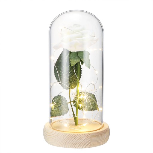 Przedmiotem tej oferty jest róża biała z trzema zielonymi listkami w kopule szklanej na jasnej drewnianej podstawce z oświetleniem LED.