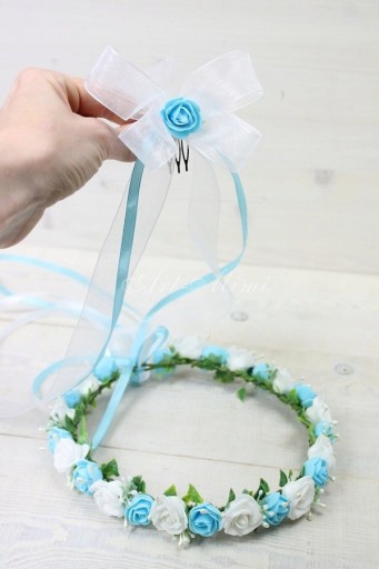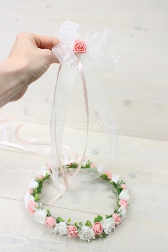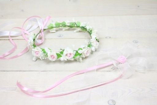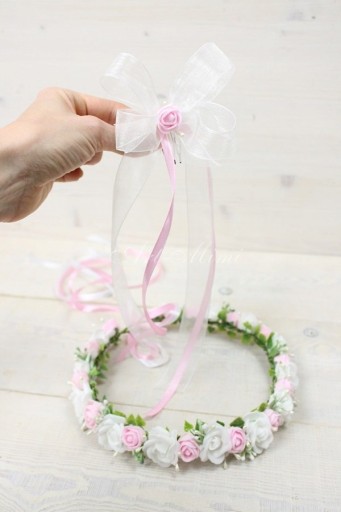 Kokarda szyfonowa z różą na grzebyku dodatkowa ozdoba do wpięcia w wianek komunijny.