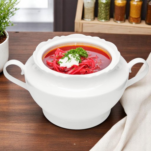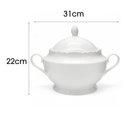 Wykonana z najwyższej jakości ceramiki waza na różnego rodzaju zupy, czy sosy jest produktem niezbędnym w każdym domu. Wyposażona w dwa wygodne uchwyty ułatwiające przenoszenie gorących potraw nabiera praktycznych cech. Dodatkowa pokrywa dołączona w zestawie - sprawia, że gorące zupy dłużej utrzymują ciepło, a także zyskują dodatkową ochronę przed owadami.