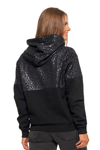 Ocieplenie od wewnątrz delikatnym meszkiem zapewnia przyjemne ciepło, idealne na chłodniejsze dni jesieni, zimy czy wczesnej wiosny. Górna część bluzy zdobiona połyskującym printem w cętki nadaje jej unikalnego i nowoczesnego charakteru, wyróżniając ją spośród klasycznych modeli. Kaptur z możliwością regulacji na sznurek gwarantuje dodatkową ochronę przed zimnem i wiatrem.