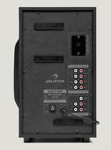 Centralnym punktem systemu kina domowego jest aktywny subwoofer, który steruje i zasila pięć kolumn-satelit. Subwoofer 5,25 z portem Bassreflex generuje we współpracy z kolumnami (cztery kolumny stojące i jedna kolumna centralna), okrągły, przestrzenny dźwięk o łącznej mocy 190 W RMS. Dzięki różnorodnym złączom 5.1-kanałowy system Areal 525 DG marki auna może odtwarzać muzykę z różnych źródeł:poprzez znajdujące się na panelu przednim porty USB i SD zestaw surround można podłączyć do przenośnych nośników danych, takich jak pendrive’y USB i karty SD, aby uzyskać dostęp do plików MP3. Złącze Bluetooth umożliwia bezprzewodowy streaming muzyki przez smartfon, tablet lub laptop. Poprzez tylny moduł wejść AUX można podłączyć do Areal 525 DG marki auna urządzenia audio wszelkiego rodzaju: komputery, odtwarzacze DVD, CD i MP3 Oprócz tego dwa przewodowe mikrofony można podłączyć do dwóch wejść jack 6,3 mm. Łączenie satelitów w sieć odbywa się za pośrednictwem wtyczek cinch i jest dziecinnie proste, a menu i ustawieniami dźwięku można sterować za pomocą pilota znajdującego się w zestawie. System surround Areal 525 DG marki auna przekonuje do siebie również pod względem wizualnym, a dzięki ogólnej eleganckiej stylistyce wkomponowuje się idealnie w wystrój każdego mieszkania.