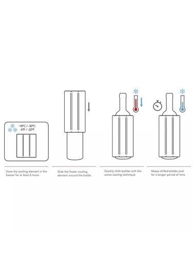 - ŁATWY W UŻYCIU: Aktywny element chłodzący jest przeznaczony do butelek wina o standardowych rozmiarach. Aby zapewnić optymalne użytkowanie, należy przechowywać element chłodzący w zamrażarce przez co najmniej 6 godzin. Po użyciu wyjmij element chłodzący z butelki wina, spłaszczyć i przechowywać w zamrażarce.