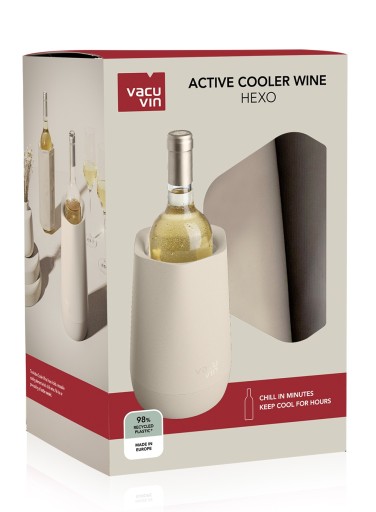 Dzięki aktywnemu elementowi chłodzącemu Hexo utrzymuje butelkę wina w idealnej temperaturze przez 90 minut. Obudowa wykonana w 98% z plastiku pochodzącego z recyklingu sprawia, że chłodziarka to także ekologiczny wybór. Łatwy w użyciu, praktyczny i elegancki produkt, który z pewnością umili wieczorne spotkania z winem.