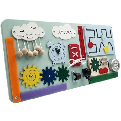 - Tablica sensoryczna w kształcie prostokąta w jasnych, przyjemnych dla oka kolorach wpływa na rozwój poznawczy dziecka, a jej ruchome elementy sprawią, że dziecko chętnie będzie się nią bawić i tym samym poszerzać zdolności manualne.