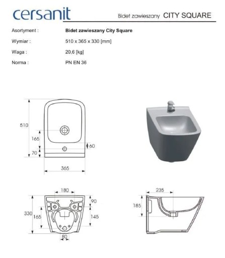 CERSANIT - Bidet wiszący CITY SQUARE (K35-045)