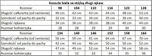 Na tej aukcji wystawiony jest rozmiar 152 (wymiary od producenta w tabeli poniżej). Koszula dostępna jest w rozmiarach od 98 do 164.