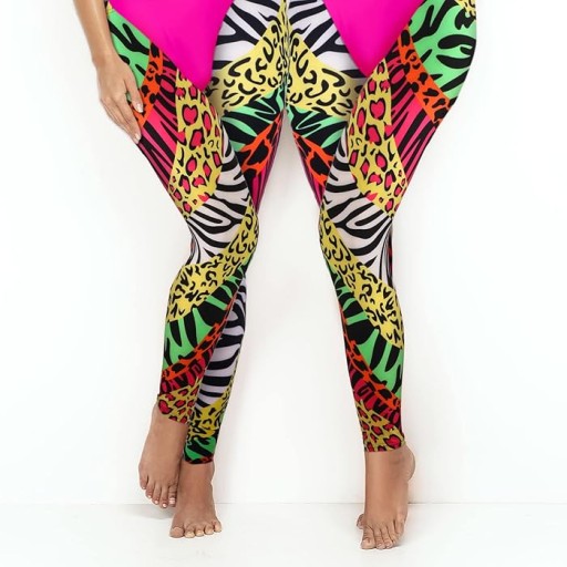 - Legginsy w odważne wzory (zebra i panterka) – Świetnie dopasowujące się do ciała, wykonane z rozciągliwego materiału, który gwarantuje swobodę ruchu. Połączenie motywów zwierzęcych w neonowych kolorach (różowy, żółty, zielony) nadaje całości wyrazistości i energii.