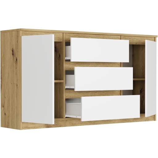 Stylowa komoda z kolekcji MODERN, stworzona dla ludzi, którzy cenią sobie nowoczesny styl i elegancję. Odnowi wnętrze każdej sypialni i salonu. Konstrukcja jest minimalistyczna ale solidna i trwała. Dzięki bez uchwytowym frontom szuflad komoda jest wygodna w użytkowaniu. Ergonomiczne wymiary komody zapewniają swobodę w umeblowaniu pomieszczenia.