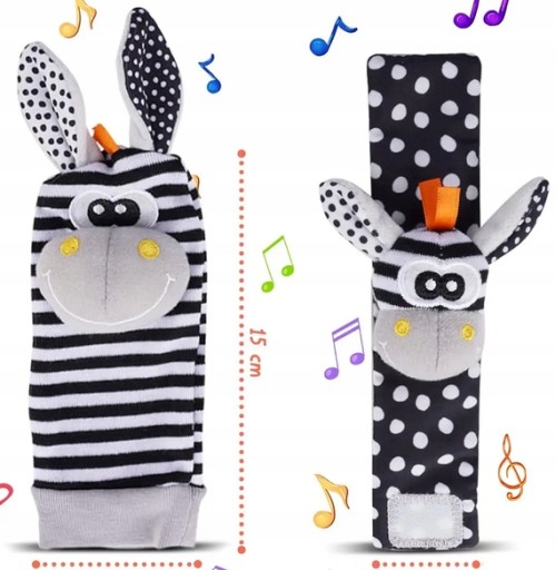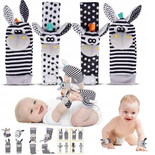 - zestaw zawiera: 2x skarpetka z grzechotką i 2x opaska na rączkę z grzechotką