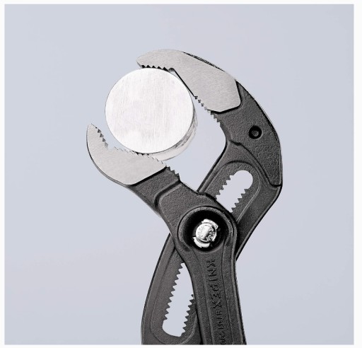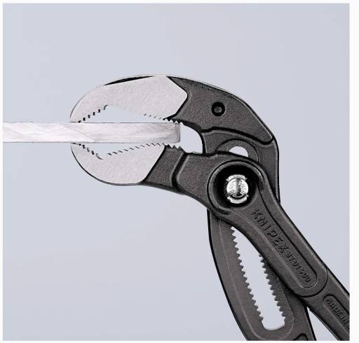 KNIPEX Cobra - szczypce do rur nowej generacji. Nigdy więcej czasochłonnego dopasowywania rozwarcia szczęk do odpowiedniego rozmiaru. Wystarczy tylko umieścić górną szczękę na chwytanym przedmiocie, nacisnąć przycisk i przyciągnąć dolną szczękę.