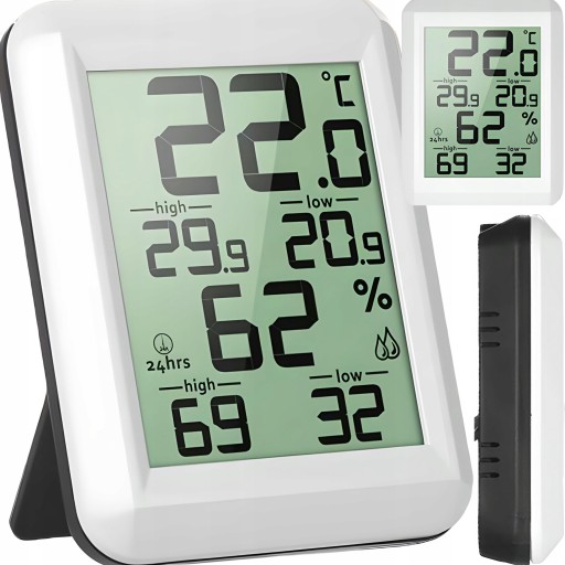 - Wyraźny wyświetlacz LCD pokazujący temperaturę wewnątrz pomieszczenia oraz wilgotność powietrza.