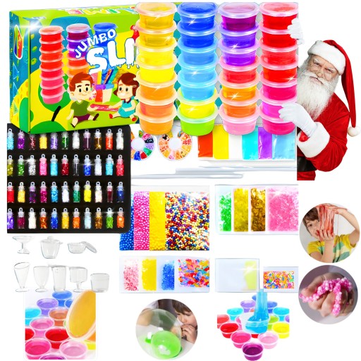 Zestaw zawiera 28 gotowych slime w różnych kolorach, kuleczki styropianowe, glinki, koraliki, foremki, ozdoby oraz proszek fluorescencyjny, co pozwala na tworzenie wielu unikalnych kompozycji i eksperymentów.
