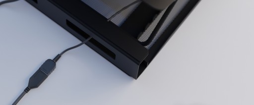 - Metalowy panel na froncie z optymalną wielkością otworów zapewnia efektywną cyrkulację powietrza i zmniejsza ryzyko przegrzania laptopa
